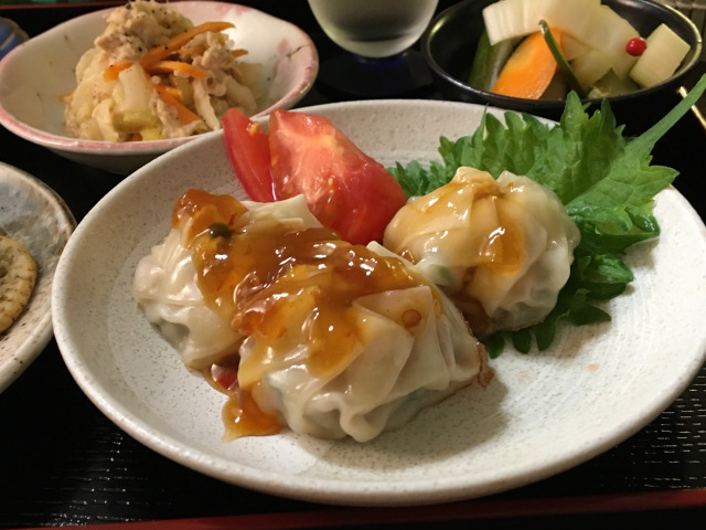 Celery, pepper, pork dumplings, with doubanjiang sauce
