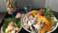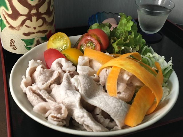 SHABU SHABU Salad – Poached thinly sliced pork, fresh vegetables aside, dress with fish broth type of soy sauce and vinegar mixed sauce.