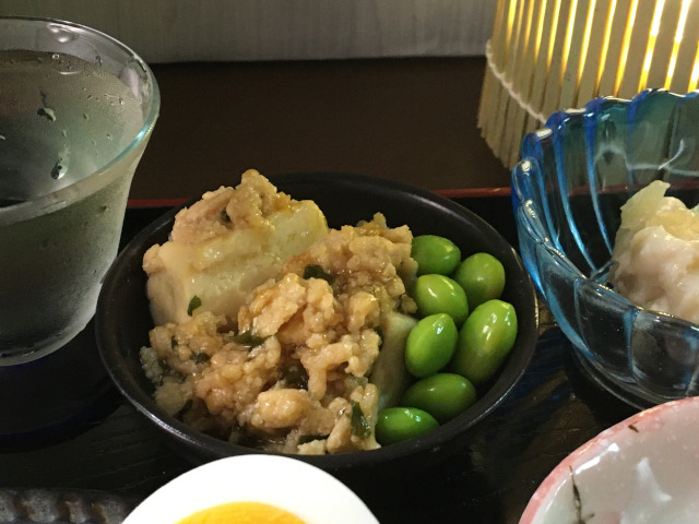Simmered tofu and ground chicken, EDAMAME beans