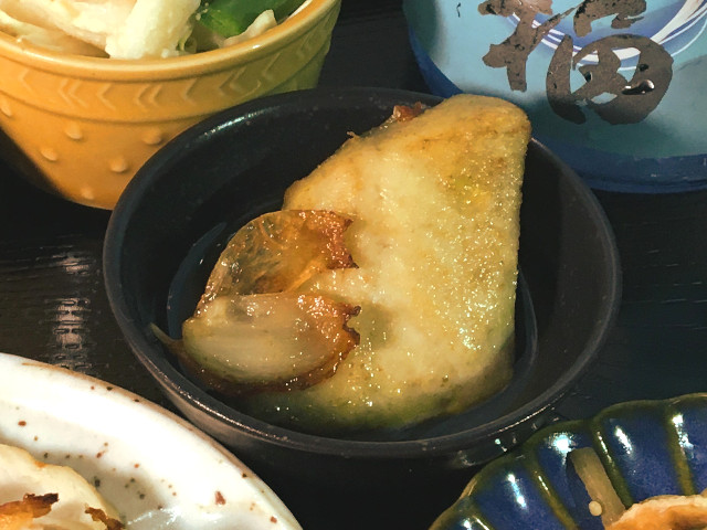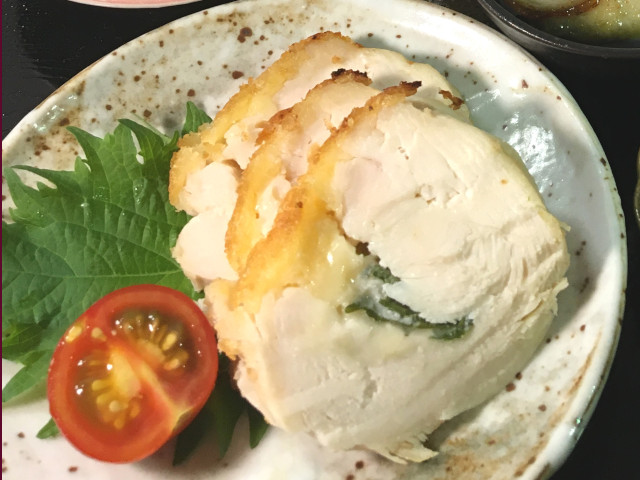 Deep fried chicken breast roll with SISO Japanese basil and cheese.