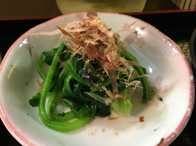 easy boiled Spinach with DASHI soy sauce on bonito flake