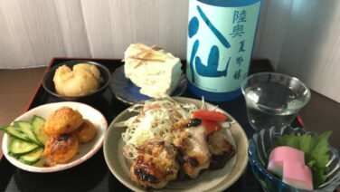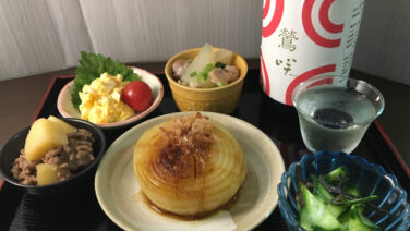 Grilled young onion with butter soy sauce on top,NIKUJYAGA, Stew grind beef and potatoes with sweet soy sauce,Egg mayo salad,Simmer DAIKON radish and chicken,Marinate in sweet vinegar with cucumber and seaweed