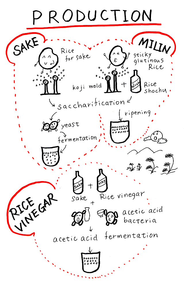Differences in production process for sake, mirin, and vinegar