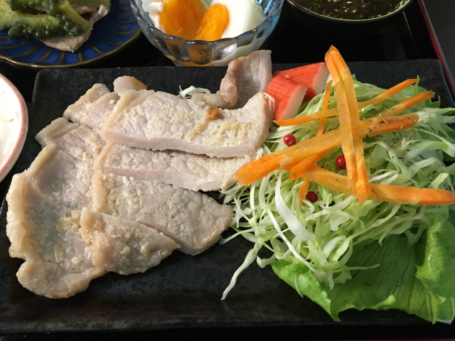Grilled salted koji marinated pork loin and fresh vegetables with homemade apple vinegar dressing