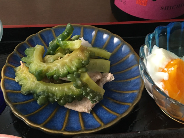 Frozen GOYA that my father harvested in the vegetable garden and also frozen pork sliced. Deep fried with sesame oil and put pinch of salt.