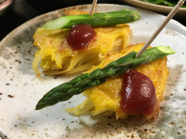 Galette grated potato with egg and asparagus